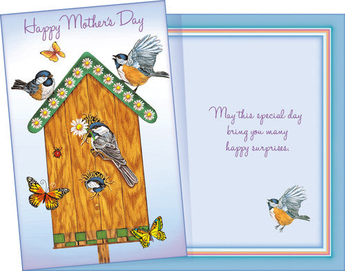 Celebrate Mother's Day with this charming birdhouse card. The unique design will surely make your mom smile. Perfect for bird lovers and those who appreciate thoughtful gestures. Share your love with a special message inside.